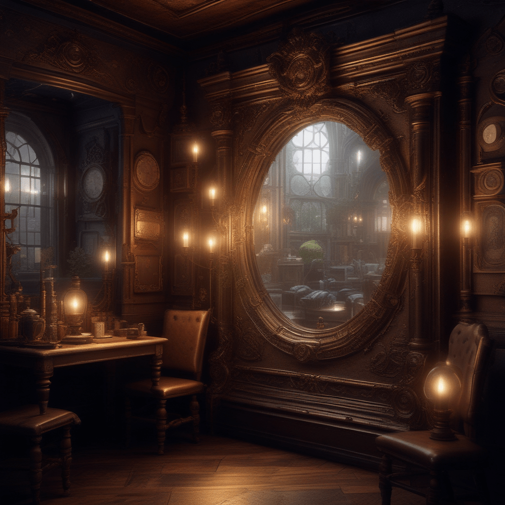 Hidden within a dusty corner of Elvyn’s Curiosities antique shop, an ornate, centuries-old mirror stands shrouded in mystery. Its frame is carved from dark, twisted wood, adorned with ancient runes and symbols, and inlaid with shimmering gemstones that seem to pulse softly with an otherworldly glow.