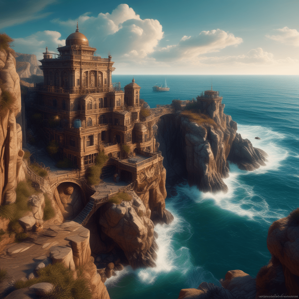 A jagged coastline with towering cliffs, carved by centuries of relentless waves, standing like sentinels guarding secrets. The sky shifts from stormy gray to fiery orange at sunset, casting long shadows and fiery reflections on the water. The salty sea breeze is thick with the scent of brine, decay, and a faint, sweet aroma – an echo of the siren’s call. Waves crash with ferocity below, shattering into white foam, whispering of danger and allure. Mysterious fog drifts in at dusk, clocking the island in an ethereal veil.