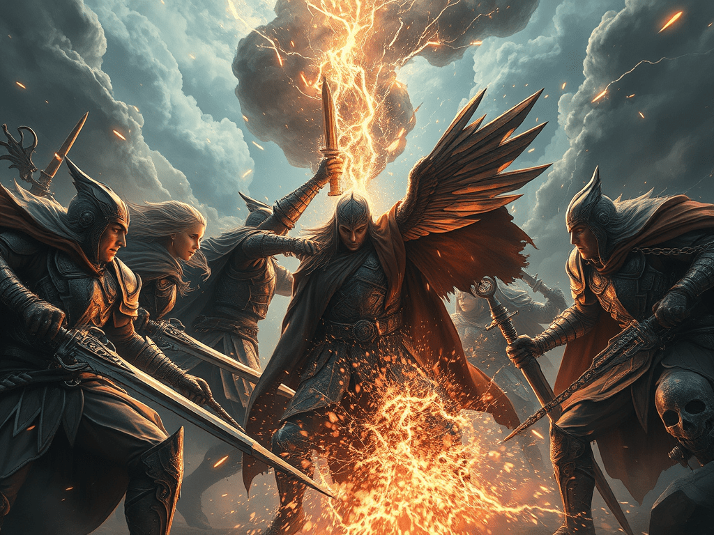 Five warriors clash beneath a storm of sparks.