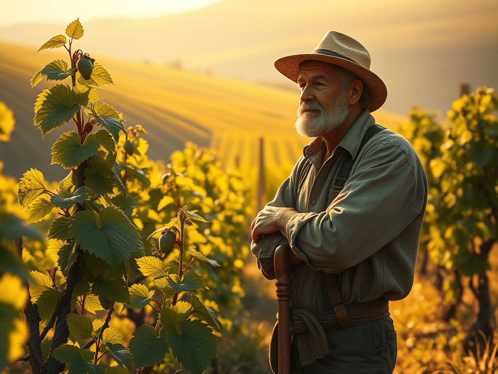 A farmer leans upon his staff, watching young vines grow.