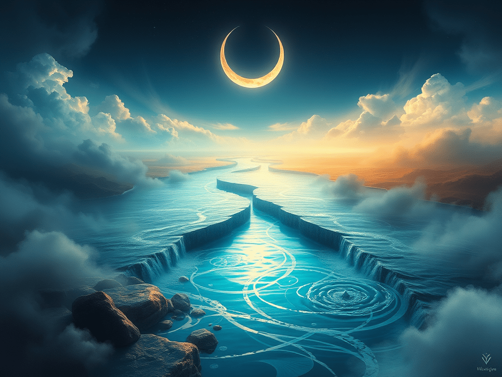 Two rivers meet beneath a crescent moon, mingling their reflections.