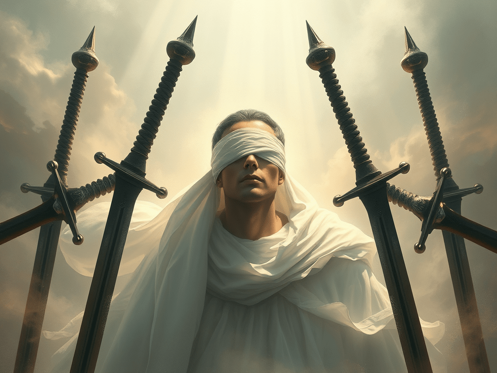 A blindfolded soul stands surrounded by swords that form an open prison.