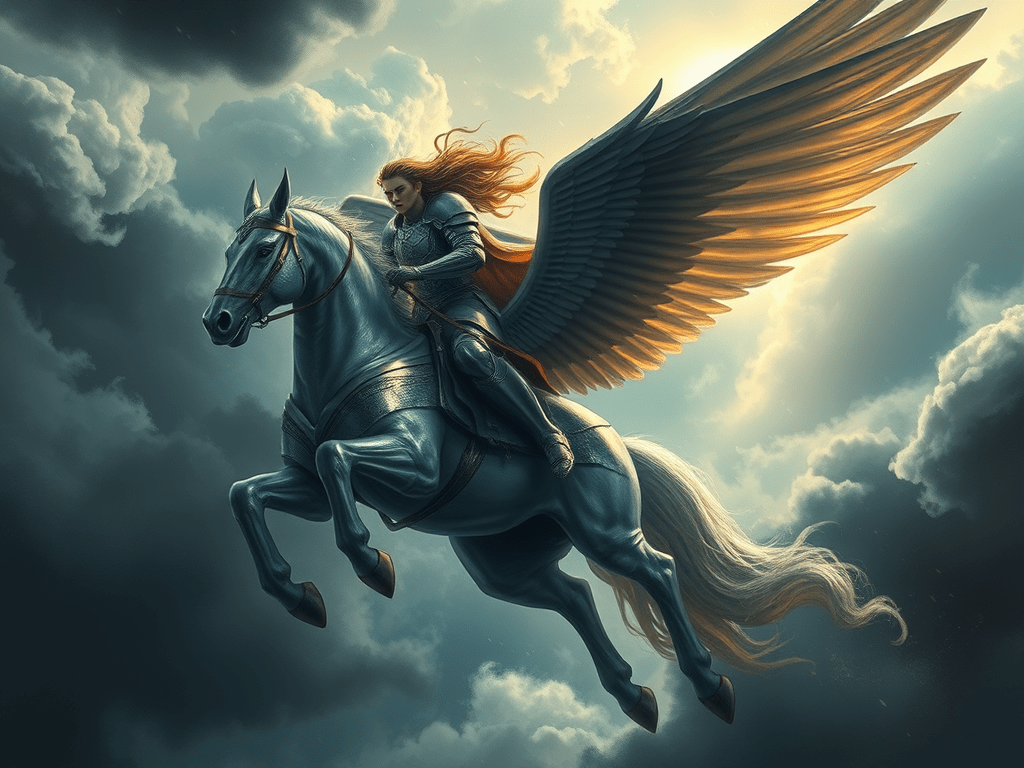 A rider on a winged steed cuts through stormclouds, carrying truth - or rumor.