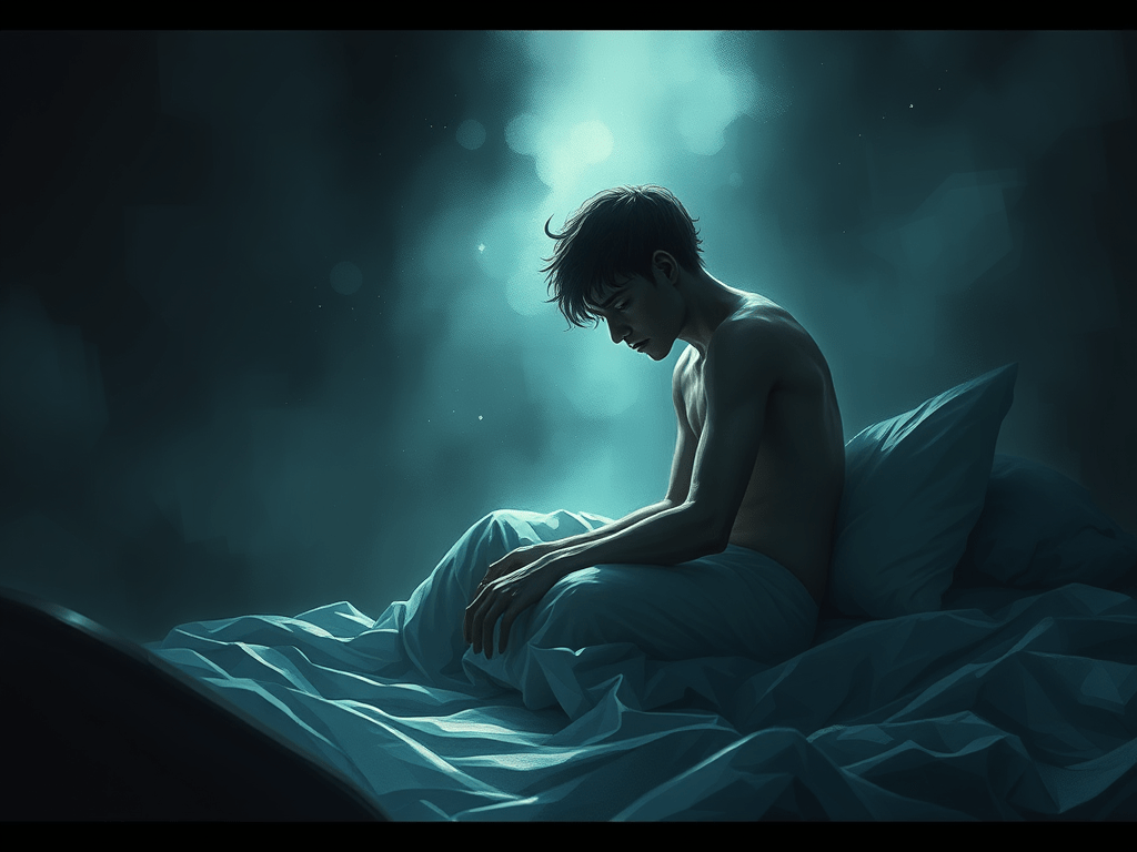 A figure sits upright in bed, haunted by shadows cast by their own imagination.
