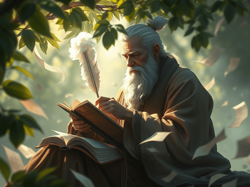 A scholar writes in the wind, his quill a feather of cloud.