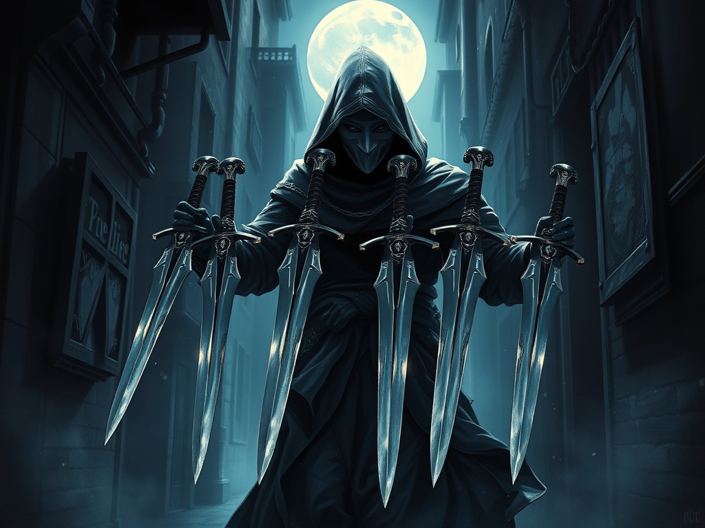 A masked figure steals away with five blades, two left behind gleaming in moonlight.