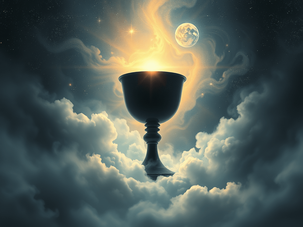 A black chalice rises from mist, its contents reflecting stars unseen by mortal eyes.