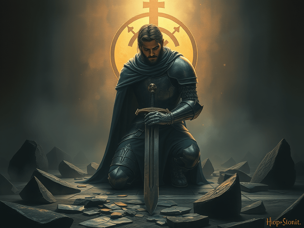 A knight kneels among shattered sigils, his sword broken across his knees.