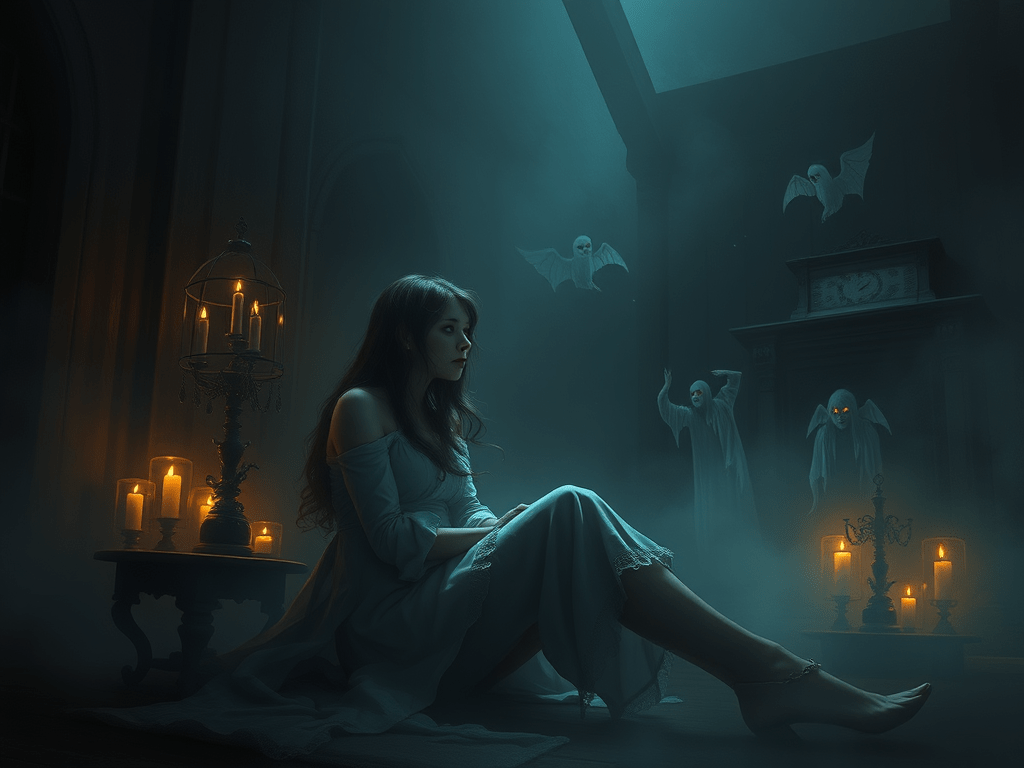A woman sits awake in darkness, surrounded by whispers of the lost.